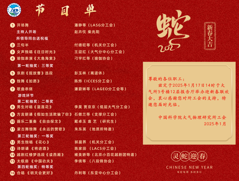 在这辞旧迎新、万象更新的美好时刻,我们满怀喜悦与期待,诚挚地邀请您参加由大气物理研究所工会精心筹备的迎新春联欢会,与大家共度一个欢乐祥和、温馨难忘的蛇年新春。