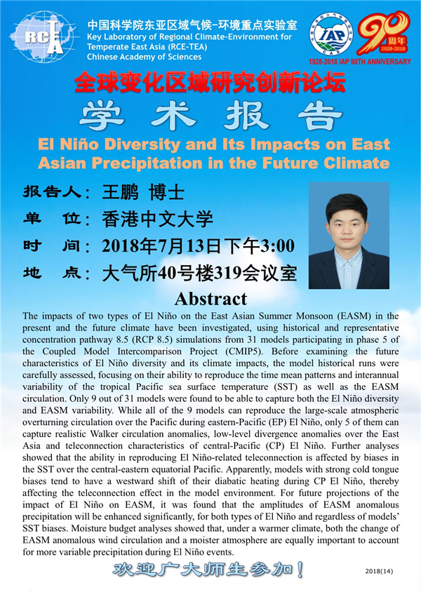 【7.13】学术报告:El Ni?o Diversity and Its Impacts on East Asian Precipitation in the Future Climate