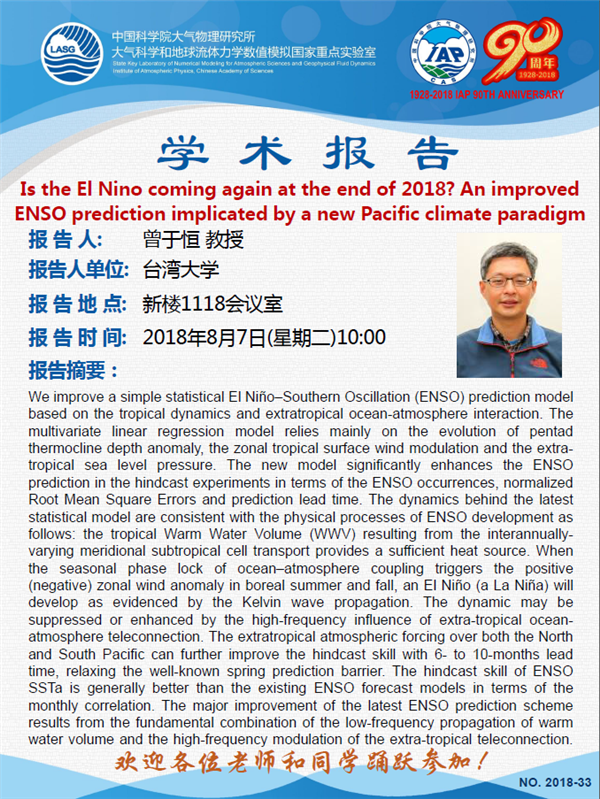【8.7】学术报告:Is the El Nino coming again at the end of 2018? An improved ENSO prediction implicated by a new Pacific climate paradigm