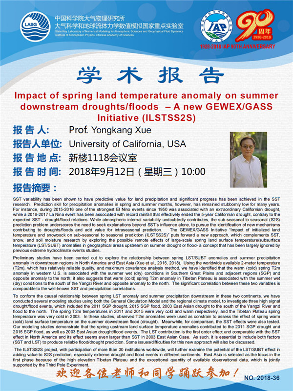 【9.12】学术报告:Impact of spring land temperature anomaly on summer downstream droughts/floods – A new GEWEX/GASS Initiative (ILSTSS2S)