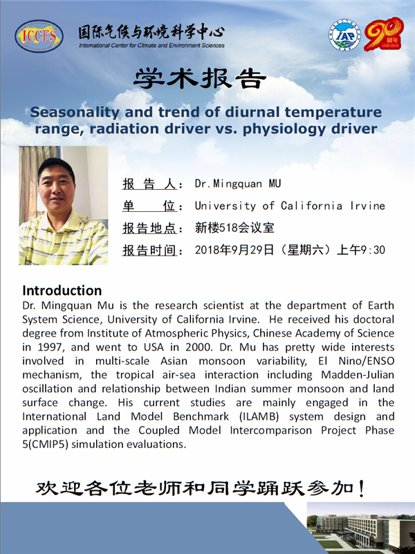 【9.29】学术报告:Seasonality and trend of diurnal temperature range, radiation driver vs. physiology driver
