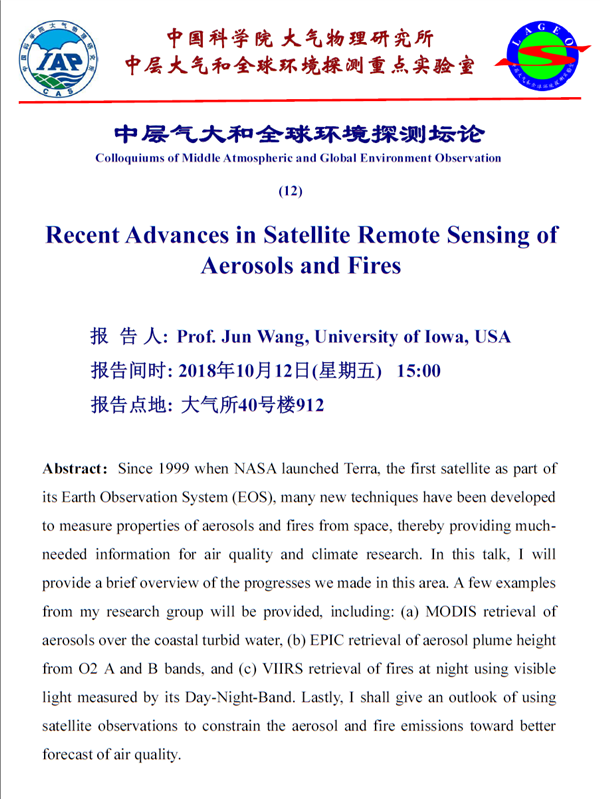 【10.12】学术报告:Recent Advances in Satellite Remote Sensing of Aerosols and Fires