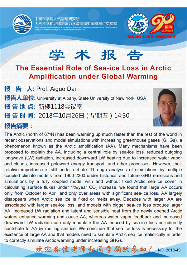【10.26】学术报告:The Essential Role of Sea-ice Loss in Arctic Amplification under Global Warming