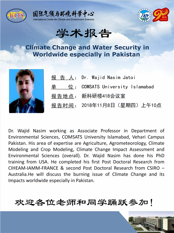 【11.08】学术报告:Climate Change and Water Security in Worldwide especially in Pakistan