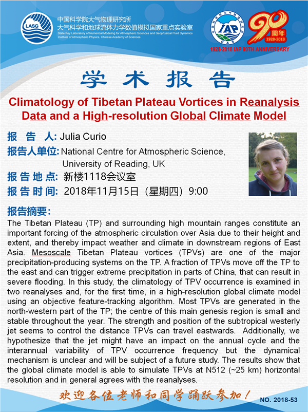 【11.15】学术报告:Climatology of Tibetan Plateau Vortices in Reanalysis Data and a High-resolution Global Climate Model
