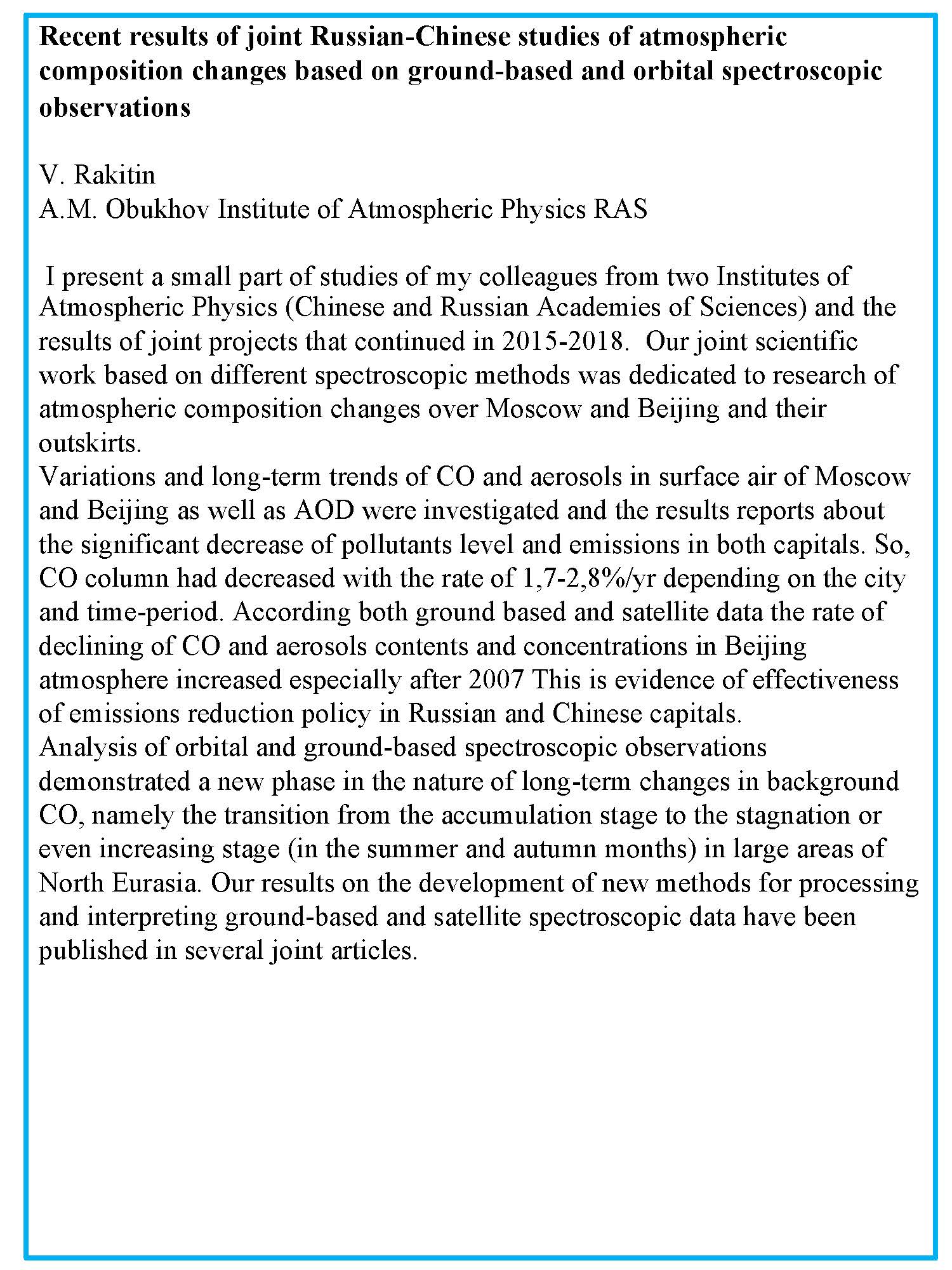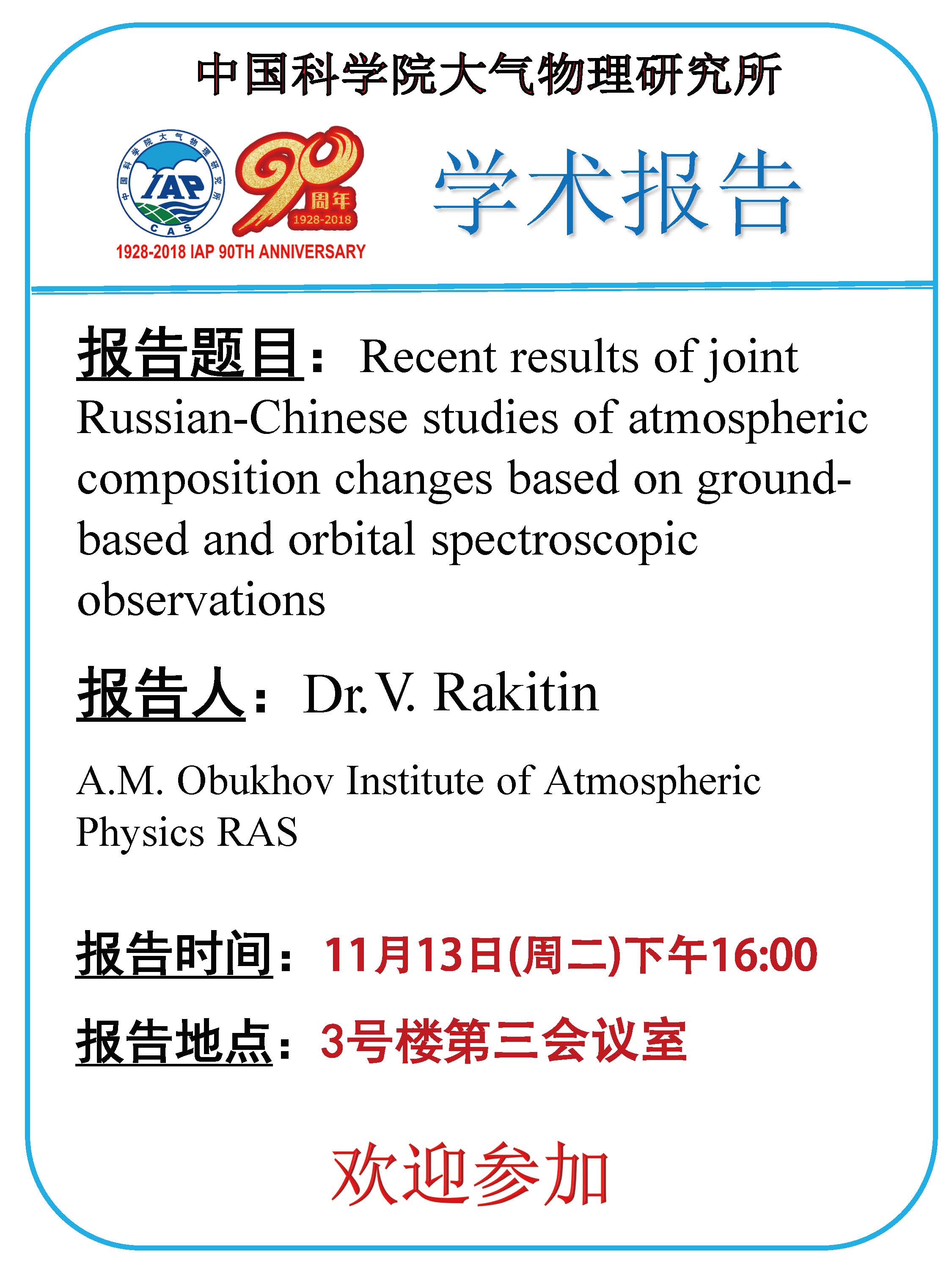 【11.13】学术报告:Recent results of joint Russian-Chinese studies of atmospheric composition changes based on ground-based and orbital spectroscopic observations