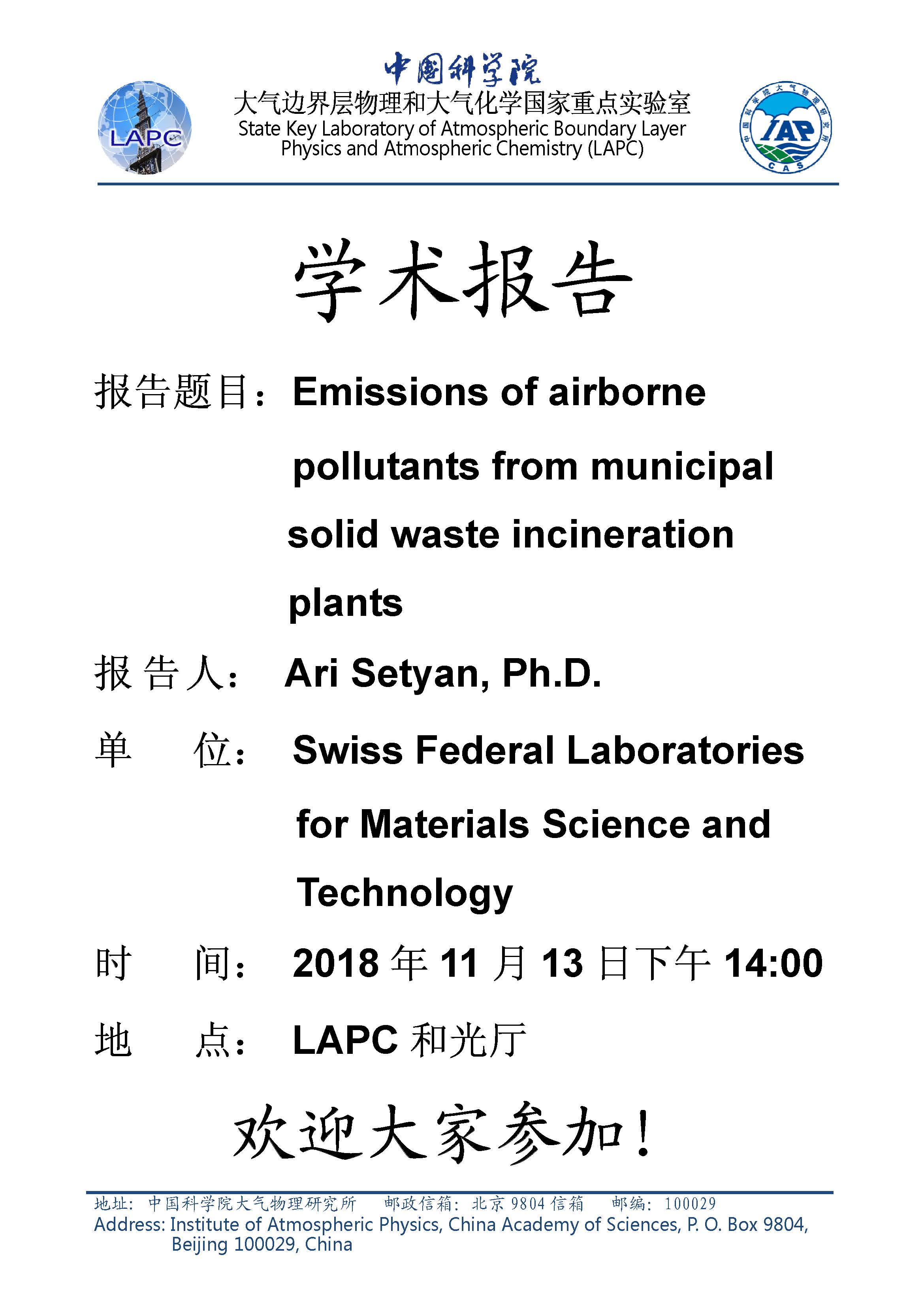 【11.13】学术报告:Emissions of airborne pollutants from municipal solid waste incineration plants