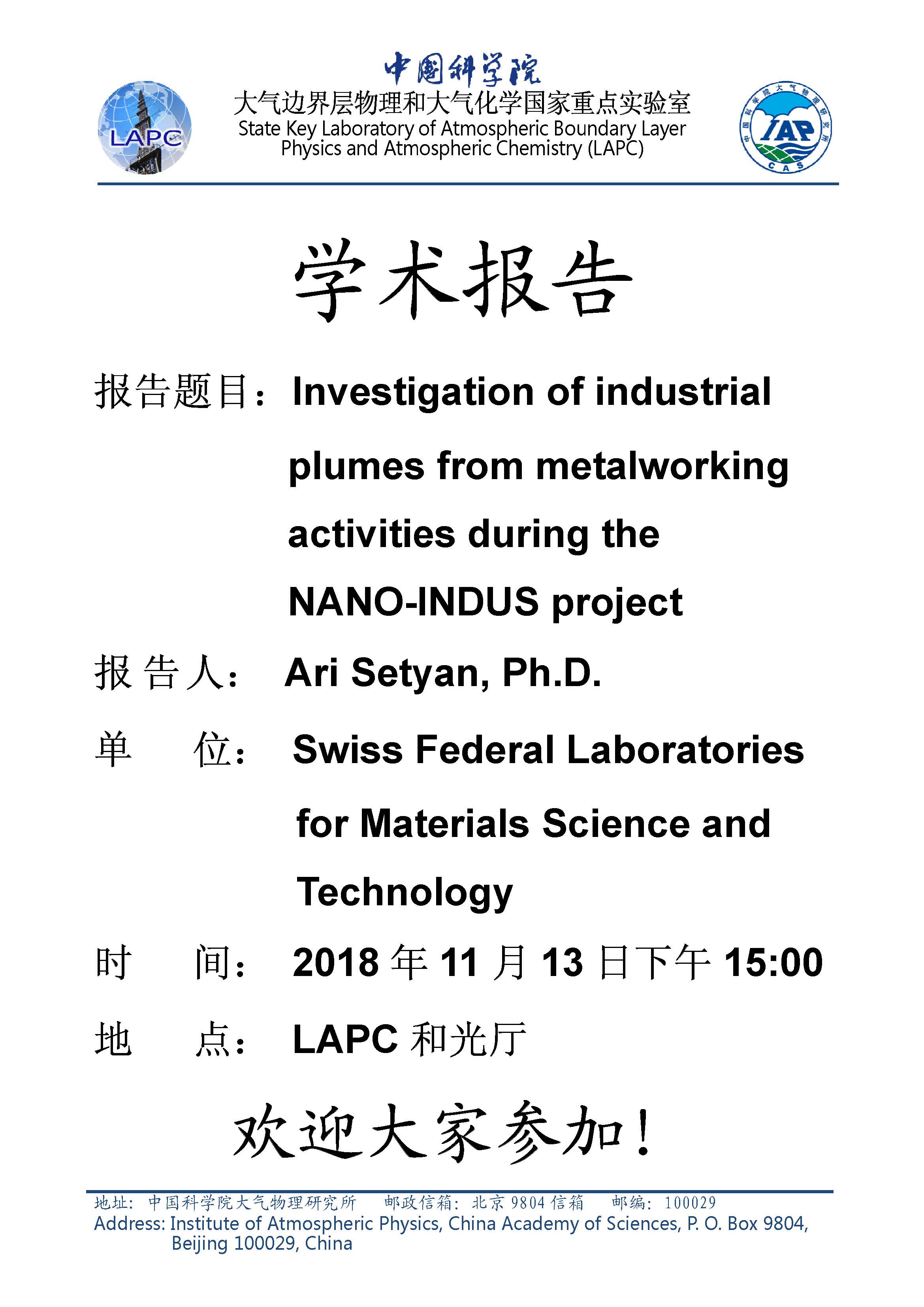 【11.13】学术报告:Investigation of industrial plumes from metalworking activities during the NANO-INDUS project