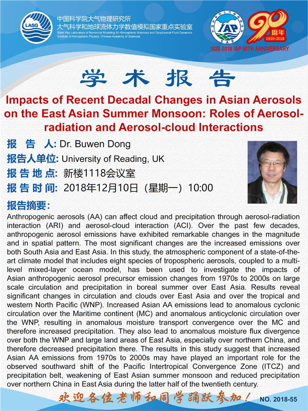 【12.10】学术报告:Impacts of Recent Decadal Changes in Asian Aerosols on the East Asian Summer Monsoon: Roles of Aerosol-radiation and Aerosol-cloud Interactions