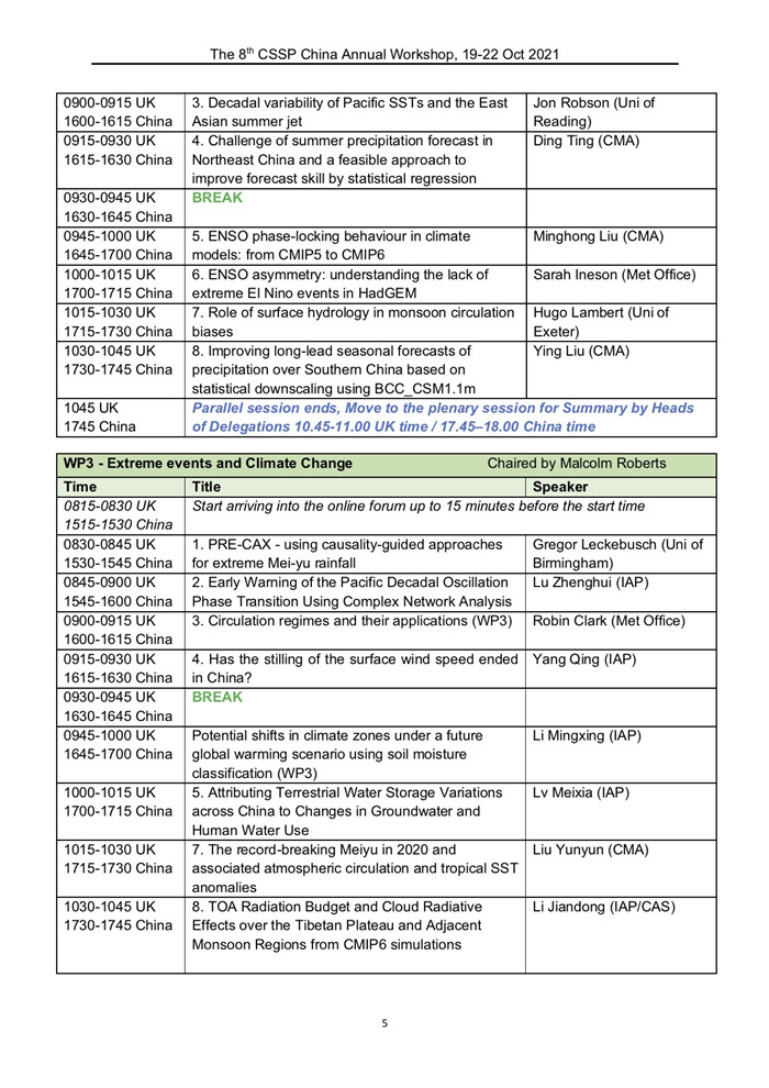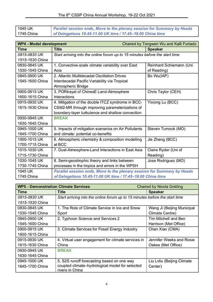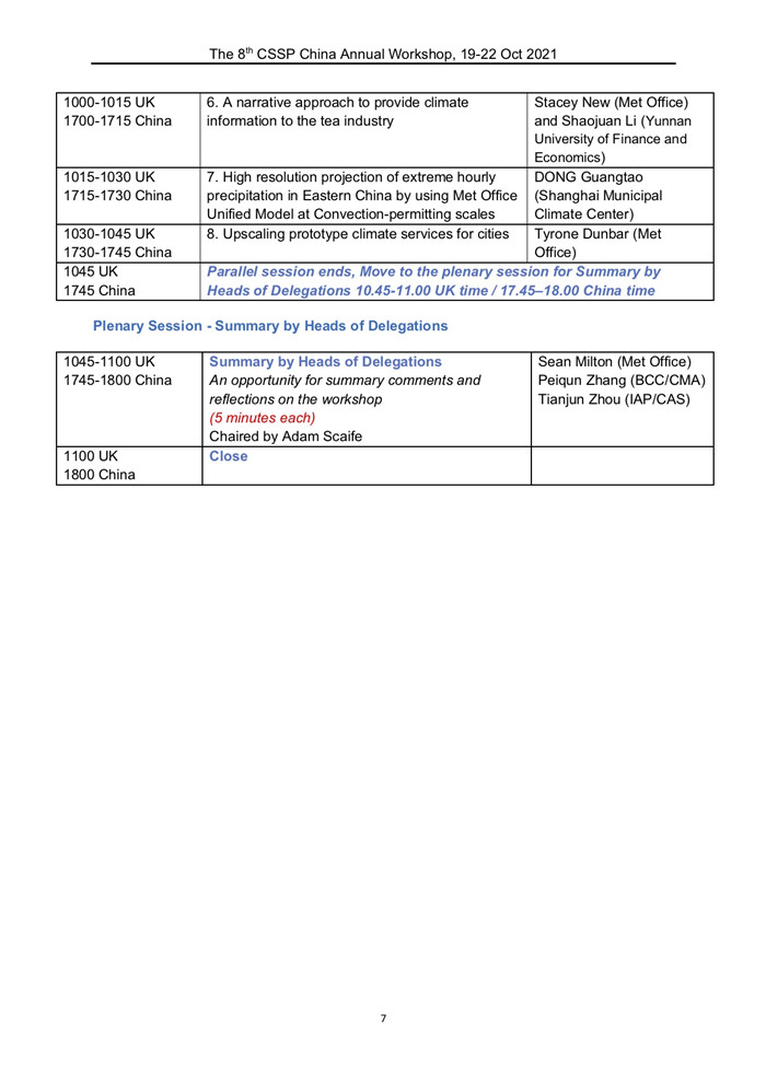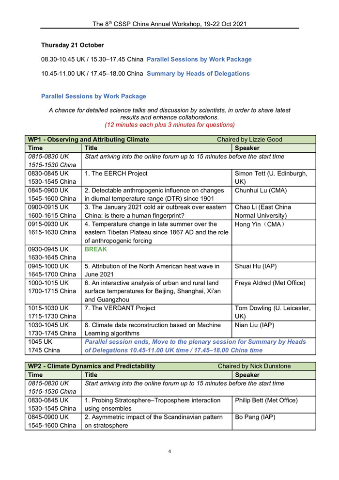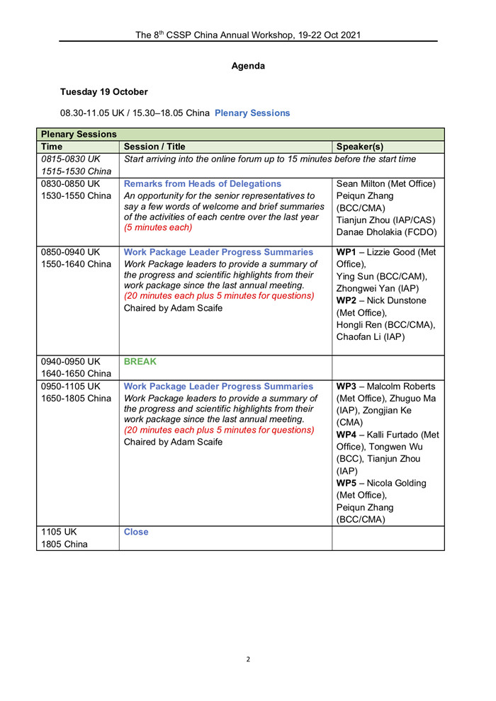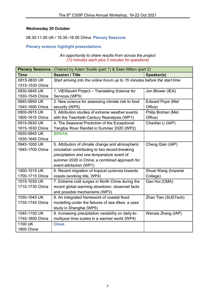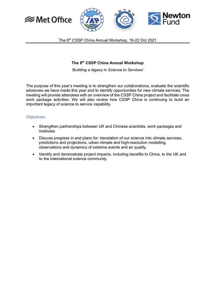 “面向服务伙伴的气候科学计划(CSSP-China)”第八次科学研讨会定于2021年10月19日至10月21日以中方代表线下参会、外方代表线上参会的形式在大气所3号楼会议室举行。本次会议由中国科学院大气物理研究所主办,中国科学院大气物理研究所、中国气象局国家气候中心和英国气象局哈德利中心联办承办。