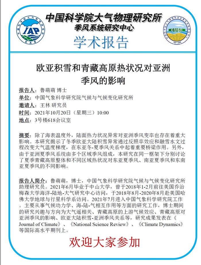 【10.20】欧亚积雪和青藏高原热状况对亚洲季风的影响