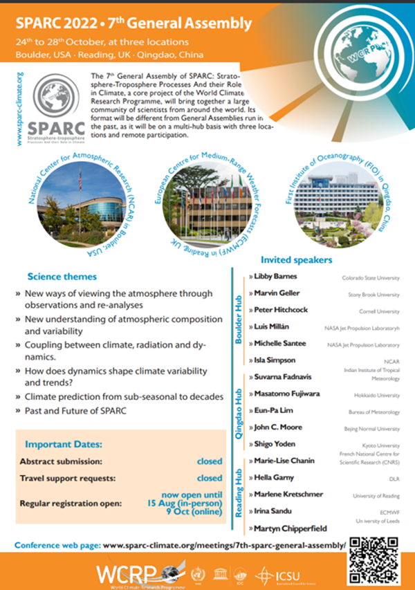 2022平流层-对流层过程及其在气候中的作用国际计划(SPARC)全球研讨会定于2022年10月24-28日举行,共设美国博尔德、英国雷丁和中国青岛3个分会场。目前官网摘要提交已截至,但感兴趣的老师仍可通过以下链接继续提交摘要:https://forms.office.com/Pages/ResponsePage.aspx?id=DQSIkWdsW0yxEjajBLZtrQAAAAAAAAAAAAO__SmUDHJUNTdaMVk1QjFYREZGM05aVjRFNTczSUVUUS4u