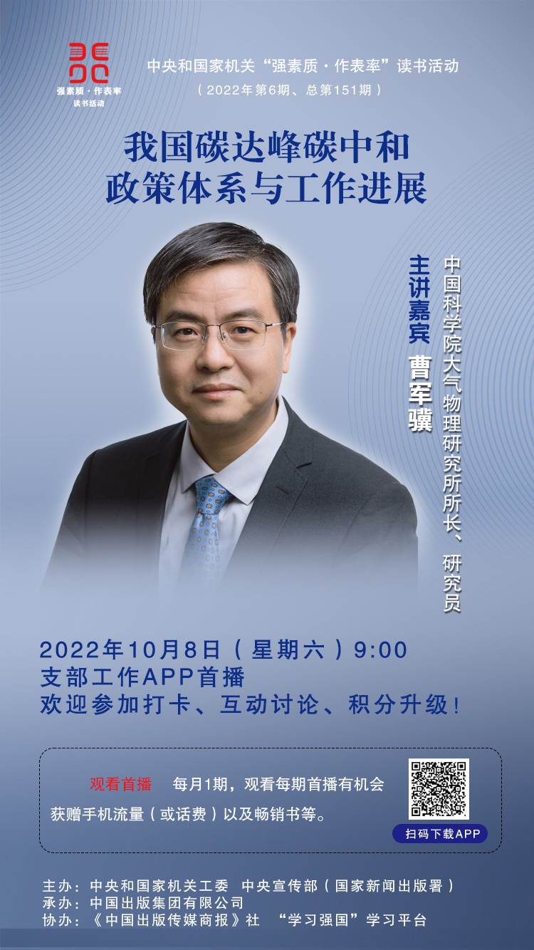2022年中央和国家机关“强素质·作表率”读书活动第六期(总第151期)来啦!特邀中国科学院大气物理研究所所长、研究员曹军骥,围绕“我国碳达峰碳中和政策体系与工作进展”为大家作辅导讲座。10月8日(本周六)上午9:00支部工作APP准时首播,100份随机抽话费、100本畅销书等您来拿!