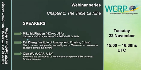 世界气候研究计划(WCRP)目前发起了5个新的大科学计划,称为“灯塔计划”,其一为“解释和预测地球系统变化”( Explaining and Predicting Earth System Change, EPESC),该计划的主要目标是:“提升从全球到区域尺度的定量化观测、解释、预警和预测地球系统变化的能力,并聚焦于年际到年代际时间尺度”。为了更好的交流全世界相关领域的进展,2022年,EPESC开始定期组织网络研讨会,每期在全球范围内邀请2~4位特邀报告人,每位报告人做20分钟主旨报告,之后为20~30分钟的圆桌讨论。