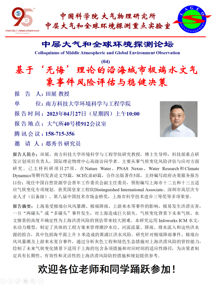 【4.27】基于‘无悔’理论的沿海城市极端水文气象事件风险评估与稳健决策