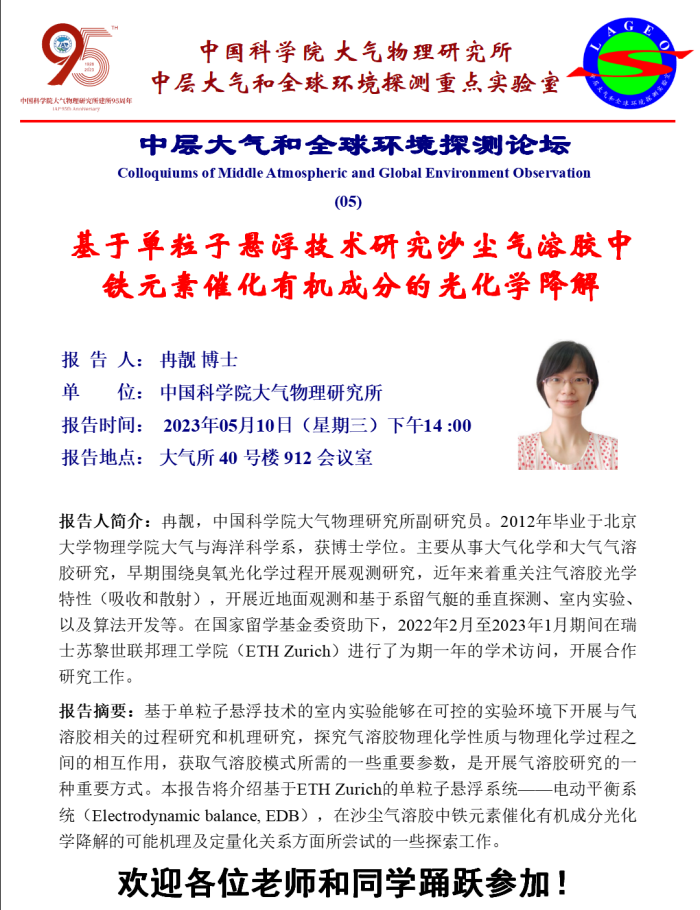 【5.10】基于单粒子悬浮技术研究沙尘气溶胶中铁元素催化有机成分的光化学降解