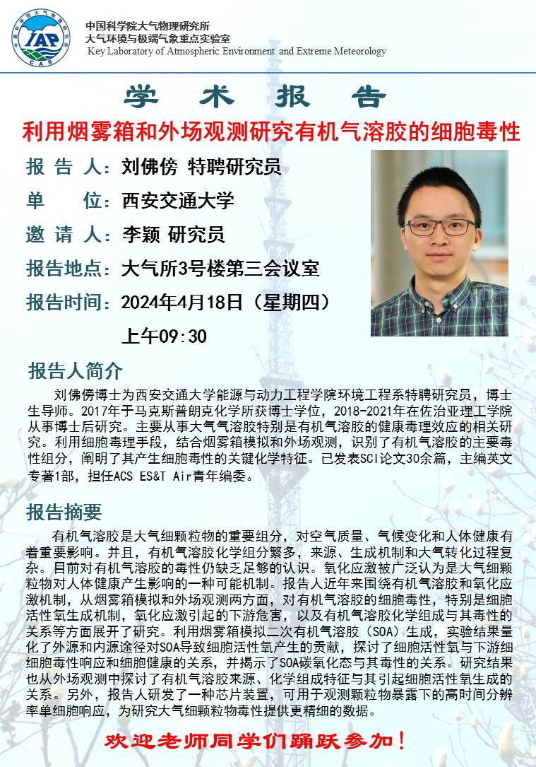 【4.18】利用烟雾箱和外场观测研究有机气溶胶的细胞毒性