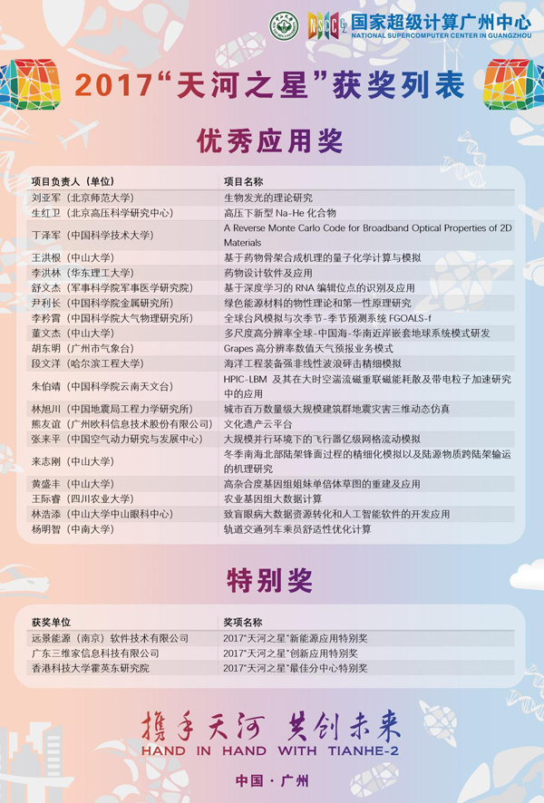 在近期召开的国家超算广州中心2017年用户年会上,LASG国家重点实验室“全球台风模拟-次季节预测系统FGOALS-f2.0”团队(李矜霄、吴小飞、王磊、何编、王晓聪、包庆、刘屹岷和吴国雄)获2017年度“天河之星”优秀应用奖。国家超算广州中心2500余家应用团队中,共收到来自全国各地100多个项目组提交的应用投稿,投稿应用涵盖工程仿真、航空航天、气象海洋环境、建筑信息模型、新材料新能源、生物信息与生物医药、数字媒体、智慧城市等领域。经过国家超级计算广州中心专家委员会的层层遴选,最终20个项目组的应用脱颖而出,荣获“2017天河之星优秀应用奖”,其中气象海洋方向同时获奖的还有中山大学董文杰教授团队的“多尺度高分辨率全球-中国海-华南近岸嵌套地球系统模式研发”和广州市气象台胡东明研究员团队的“Grapes高分辨数值天气预报业务模式”。