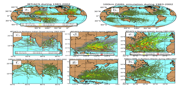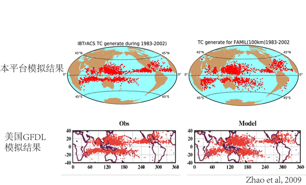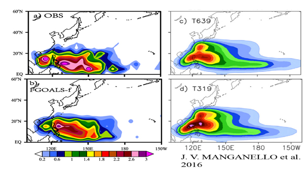 FGOALS-f2.0台风预测团队基于自主版权的气候系统模式FGOALS-f2.0,研发“台风模拟及次季节-季节预测系统”。该平台依托天河2号超级计算机,使用百万核时开展预测试验,在天河2号平台上完成了总计5千年的稳定积分。在台风模拟中,FGOALS-f2.0预测系统仅使用100公里水平分辨率,即可较准确模拟我国西北太平洋乃至全球的台风产生位置(图1)、台风移动路径(图2)。