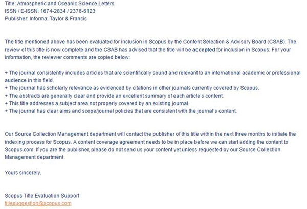 2019年3月,《大气和海洋科学快报》(Atmospheric and Oceanic Science Letters,AOSL)出版商Taylor&Francis收到Scopus Title Evaluation Support通知:AOSL已通过Scopus内容选择与咨询委员会(Content Selection & Advisory Board,CSAB)的严格评估,正式被Scopus数据库收录。
