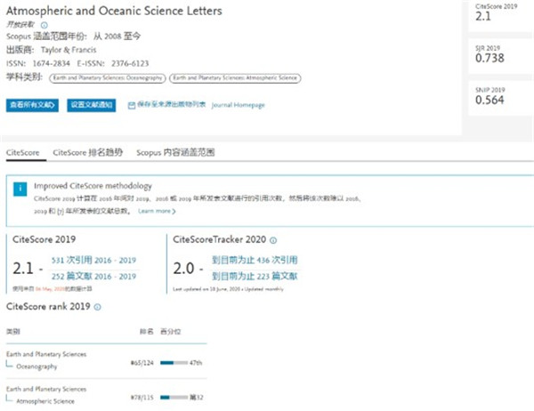 日前,Elsevier发布了2019年最新的CiteScore,大气所主办的学术期刊《大气科学进展》(AAS)、《大气与海洋科学快报》(AOSL)和《大气科学》的CiteScore分别为3.8、2.1和1.0,其中AOSL分值2.1为获得的首个CiteScore。三本期刊在大气科学的排名分别为48/115、78/115和94/115。此外,AOSL在海洋学的排名为65/124。