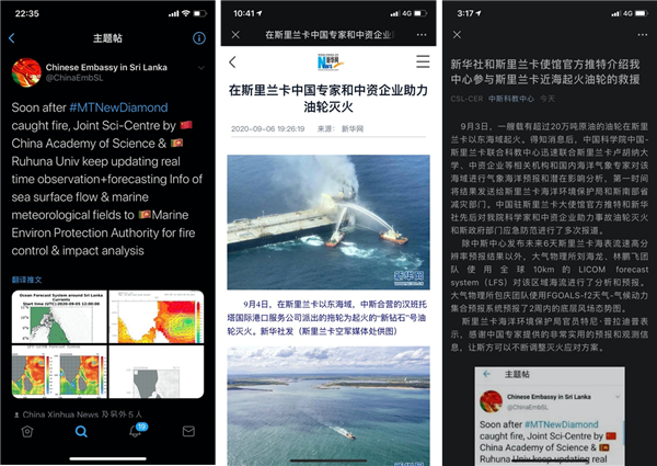 中国驻斯里兰卡大使馆官方推特、新华社和科学网先后对我院科学家助力事故油轮灭火和斯政府部门应急防范进行了多次报道。斯里兰卡海洋环境保护局官员特尼?普拉迪普表示,感谢中国专家提供的非常实用的预报和观测信息,让斯方可以不断调整灭火应对方案。