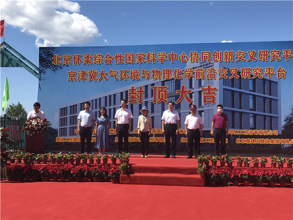 2020年9月8日上午,北京怀柔综合性国家科学中心协同创新交叉研究平台—京津冀大气环境与物理化学前沿交叉研究平台在北京怀柔科学城东部组团密云经济开发区举行主体结构封顶仪式。中国科学院大气物理研究所副所长周天军(主持工作),密云科学技术委员会主任杨光辉,大气所怀柔科学城办公室主任张木兰,大气所平台项目经理李垒及项目监理单位、设计单位、管理公司、施工单位等相关人员列席参加。