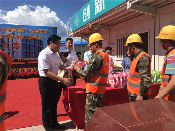 最后,与会领导至施工现场,为封顶添了最后一方混凝土,一同为建设施工人员发放慰问品,并再次表达感谢。京津冀平台封顶仪式圆满结束。(怀科办、所基建小组供稿)
