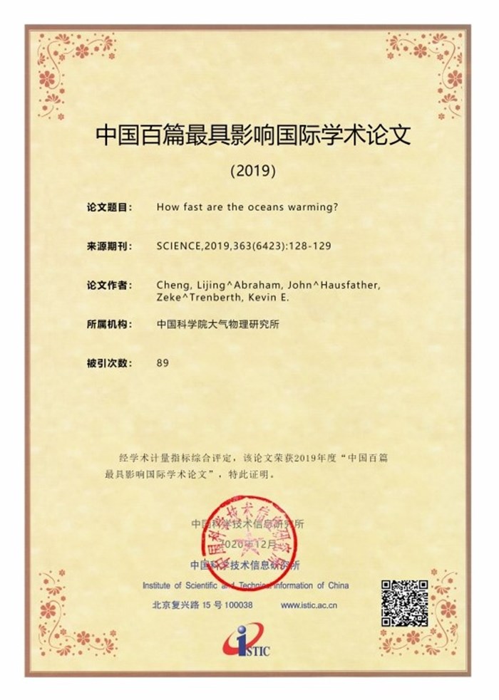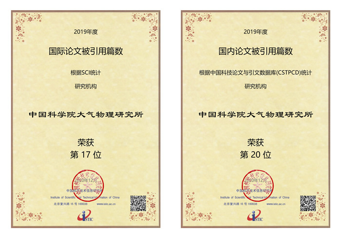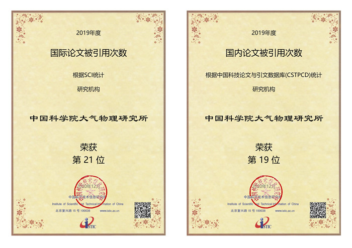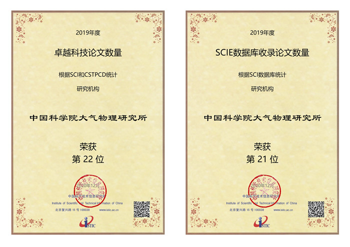 2020年12月29日,中国科学技术信息研究所在线发布2019年度中国科技论文统计结果。统计结果显示,我国高质量国际论文数、高被引论文数、热点论文数均居世界第2位。大气所在该份报告中表现优异,分别位居:发表高质量国际论文数量最多的世界研究机构第13位、2019年中国卓越科技论文较多的研究机构第22位、2019年SCIE数据库收录论文数量第21位、2019年国际论文被引用篇数较多的研究机构第17位、2019年国内论文被引用篇数第20位、2019年国际论文被引用次数较多的研究机构第21位、2019年国内论文被引用次数较多的研究机构第19位。此外,我所成里京副研究员发表在SCIENCE上的第一作者文章入选中国百篇最具影响国际学术论文。