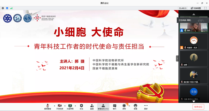 2021年2月4日下午,大气所举办中科院2020年度人物报告会,邀请中科院2020年度感动人物、国家干细胞资源库主任、中国科学院动物研究所副研究员郝捷来所做分享报告。为防控疫情,此次报告采取线下、线上结合的方式,线下20余位、线上近200位党员、职工参加。党委书记陆日宇参会,纪委书记王生林主持会议。