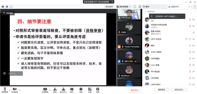 孙业乐研究员结合自己在大气化学和观测实验领域的基金申请书撰写和评审经验,分享了他的体会。他指出基金申请关键是要有一个好的立意和选题、有2-3个好的科学问题、有相对熟悉的研究基础。他还对申请书撰写分部分进行了详细讲解,提出了实用性的建议。科技处副处长李慧群向大家介绍了2022年基金委的申报的一些新政策、注意事项和全所基金申报安排。