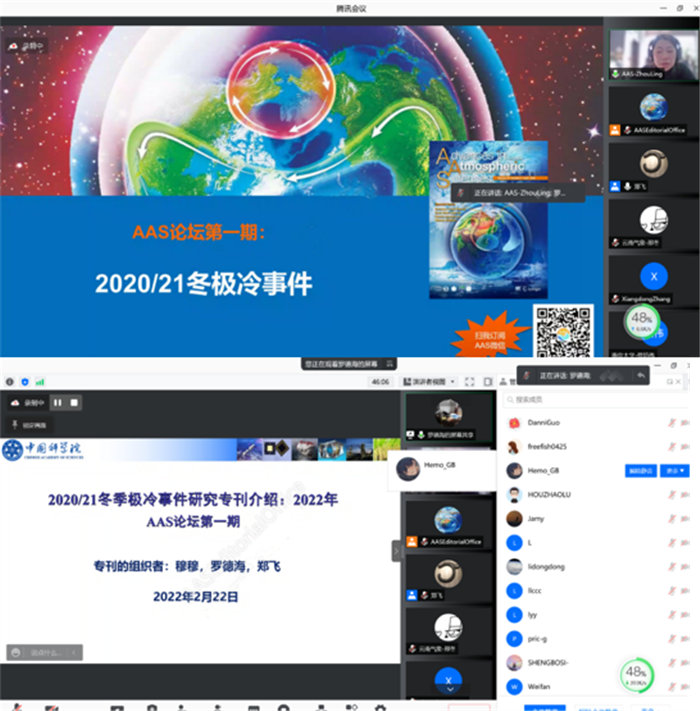 为搭建大气科学领域高水平学术交流平台,2022年2月23日下午,由国际气象和大气科学协会中国委员会、中国科学院大气物理研究所和中国气象学会主办的期刊《大气科学进展》(Advances in Atmospheric Sciences, 简称AAS)编辑部举办了“2020/21冬极冷事件”线上学术论坛。本次论坛受主编穆穆院士委托,由罗德海研究员和郑飞研究员召集, 八位学者做了特邀报告,分享2020/21从东亚到北美极端寒潮事件的最新研究进展。400多人通过腾讯会议和在线直播观看了学术报告,会议期间大家踊跃提问,报告人进行了耐心解答。