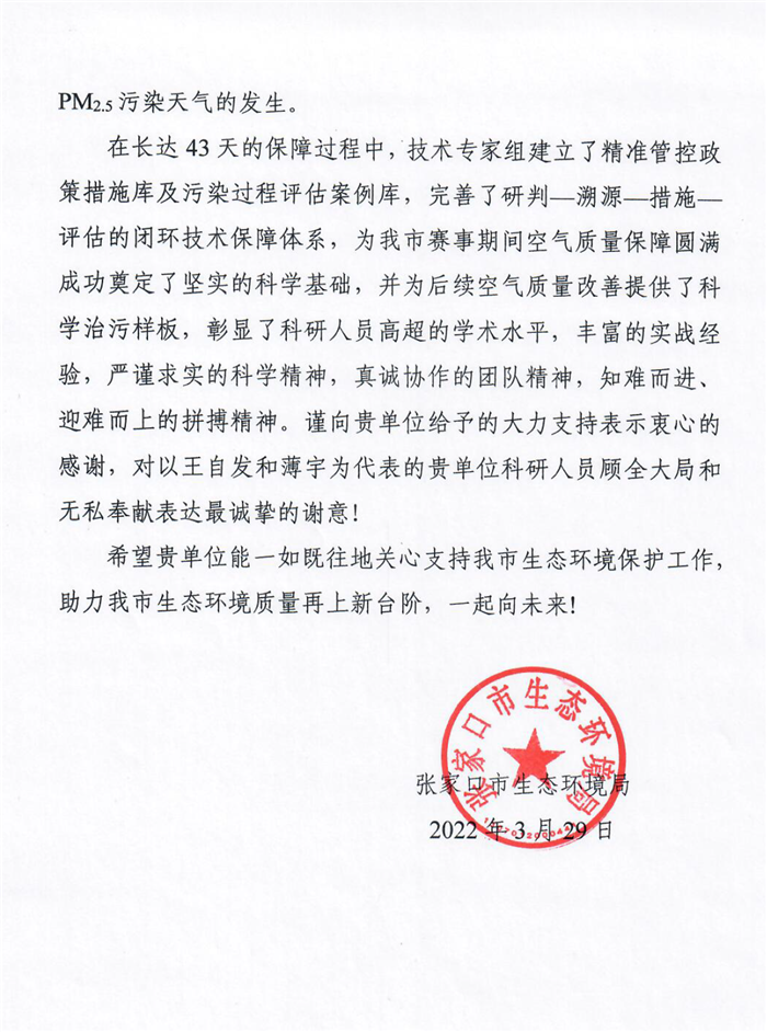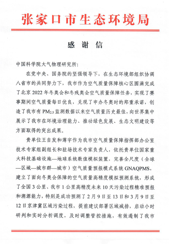 为感谢我所王自发和薄宇作为张家口市空气质量保障指挥部办公室技术专家组副组长和驻场技术专家负责人,依托地球系统数值模拟装置和空气质量预报模式系统,建立了面向冬奥会保障的空气质量高精度模拟预测系统,实现了赛事期间空气质量每日优良,兑现了申办冬奥时的郑重承诺,创造了张家口市有PM2.5监测数据以来空气质量历史最佳,特发来感谢信。希望大气所能继续助力张家口市生态环境质量再上新台阶,一起向未来!(所办供稿)