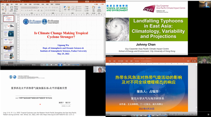 吴立广教授作为第一个主讲人,抛出“气候变化是否令台风强度增强”这个问题,结合团队和国内外的研究,综述了当前国际上关于气候变化影响海盆尺度台风强度认识的进展,强调了气候变化对海盆尺度台风强度的影响机理不同于单个台风,提出了团队在台风气候方面的见解与思考,建议了台风气候学领域的优先研究议题。Johnny Chan教授以“东亚的登陆台风:气候变化、变率和预测”为主题,探讨了登陆台风频率和强度的空间、时间的变化,并预估了未来登陆台风频率和强度变化。陆日宇研究员基于1979-2018年JTWC和NCEP-2再分析数据集,介绍了夏季西北太平洋热带气旋对东亚-太平洋遥相关型的影响,并提出热带气旋作为一种强烈天气系统可以显著地加强西北太平洋和东亚的夏季气候异常。占瑞芬教授介绍了热带东风急流对热带气旋活动的影响及对不同全球增暖模态的响应,基于热带东风急流-热带气旋的关系探讨了全球变暖背景下未来热带气旋变化的不确定性,指出基于未来热带东风急流的变化,西北太平洋和印度洋热带气旋活动也可能出现不同的响应。并特别说明,未来西北太平洋热带气旋活动对不同全球增暖的类型是敏感的。