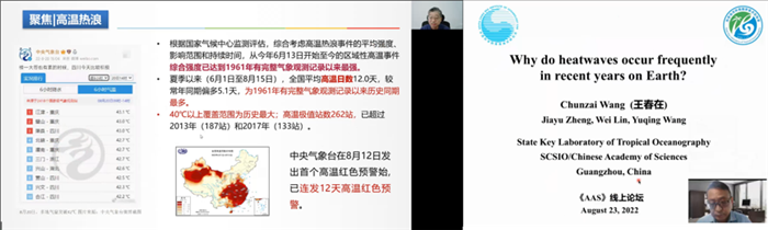 2022年8月23日上午,针对当前公众最关注的重要问题之一——近年来地球上热浪频发的原因,《大气科学进展》(AAS)特别邀请热带海洋环境国家重点实验室主任,国家高层次人才引进计划专家,中国科学院南海海洋研究所王春在研究员做专场报告,深入剖析了高温热浪频发的原因。AAS编委、复旦大学大气与海洋科学系副系主任(主持工作)温之平教授主持了本次论坛,并在开场报告中介绍了高温热浪事件的气候背景。