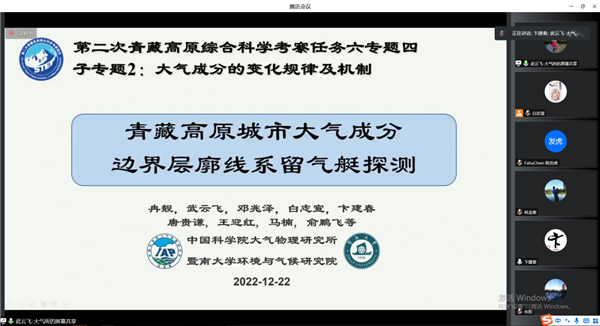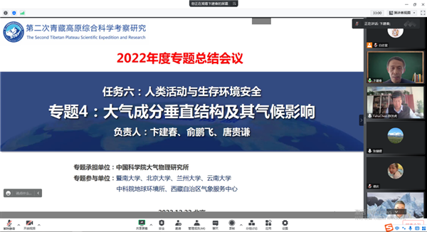 2022年12月22日,由大气所牵头承担的第二次青藏高原综合科学考察研究任务六“人类活动与生存环境安全”专题四“大气成分垂直结构及其气候影响”召开2022年度工作总结会议。受疫情影响,会议采用线上视频的方式,邀请了第二次青藏科考领导任务六负责人陈发虎院士、康世昌研究员、张镱锂研究员进行指导,北京大学朱彤院士、大气所周天军副所长、科技处姚利处长、王跃思研究员也受邀对专题工作进行指导建议。各子专题项目人员共计55人参加会议,会议由专题负责人卞建春研究员主持。