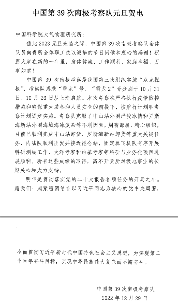 值此2023元旦来临之际,中国第39次南极考察队给我所全体职工发来贺电,感谢我所对极地事业的长期关心和大力支持。