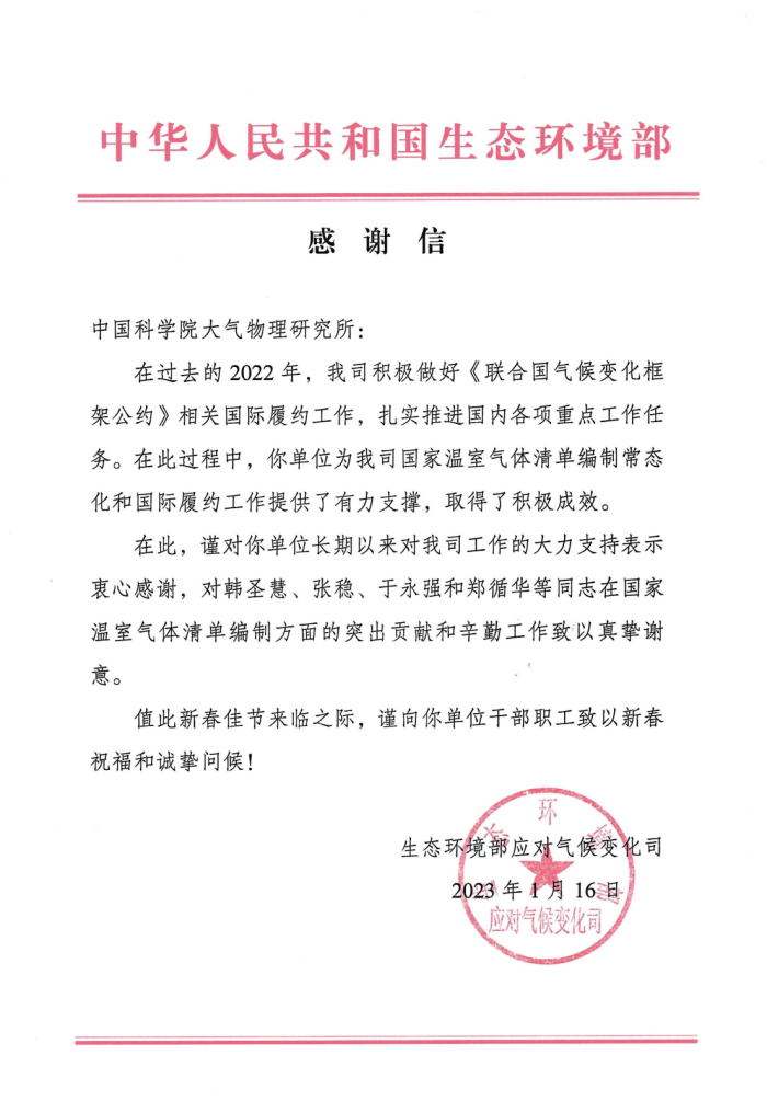 2023年1月16日,生态环境部应对气候变化司给大气所发来感谢信,感谢我所韩圣慧、张稳、于永强和郑循华等同志在国家温室气体清单编制方面的突出贡献和辛勤劳动。