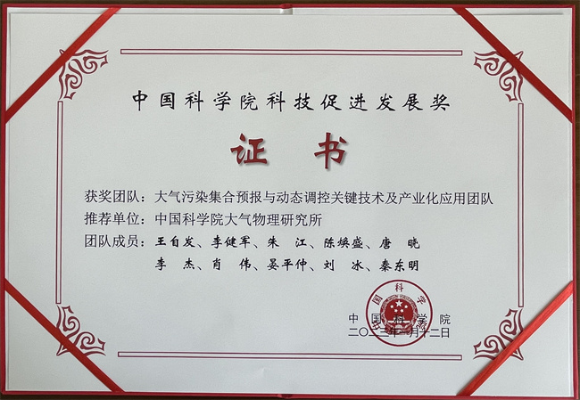 2月11日,中国科学院在2023年度工作会议上公布了2022年度科技促进发展奖名单。大气物理研究所牵头的“大气污染集合预报与动态调控关键技术及产业化应用”团队荣获2022年科技促进发展奖,团队负责人为大气所王自发研究员,主要成员包括大气所朱江、唐晓、李杰、晏平仲以及中国环境监测总站和中科三清科技有限公司相关人员。