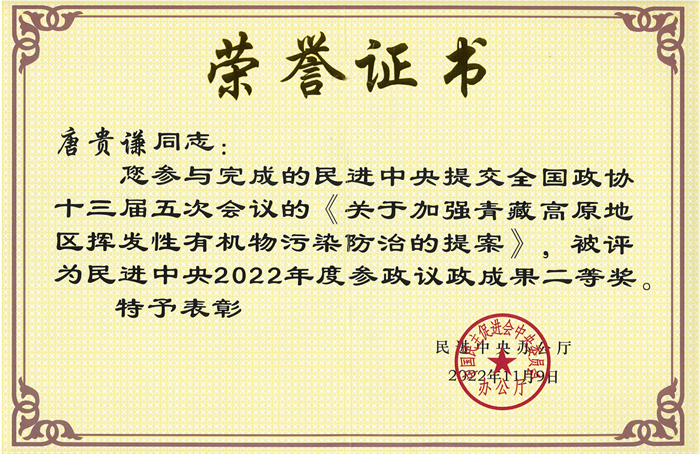 唐贵谦、王跃思、卞建春研究员撰写的《加强青藏高原地区挥发性有机物污染防治》的提案,指出因为机动车和溶剂相关的排放源显著增加,青藏高原地区大气挥发性有机物污染恶化,且有较高健康风险。建议尽快制定高海拔地区“车”和“油”发展战略方案,完善标准体系,全方位方法挥发性有机物污染蔓延。该研究获第二次青藏科学考察资助,成果发表在《iScience》。成果转化的提案被评为民进中央参政议政成果二等奖。