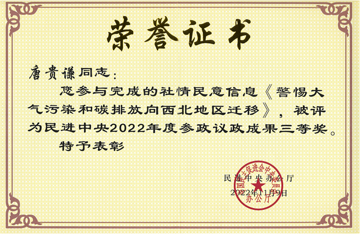 唐贵谦、王跃思研究员提交的《警惕大气污染和碳排放向西北迁移》社情民意信息,指出近年来大气污染和碳排放从我国东部地区向西北部迁移的问题,建议深化产业结构改革,提高大气污染物末端处理能力,改善西北地区的大气环境。该成果发表在《中国科学院院刊》,成果转化的提案被评为民进中央参政议政成果三等奖。(所办供稿)