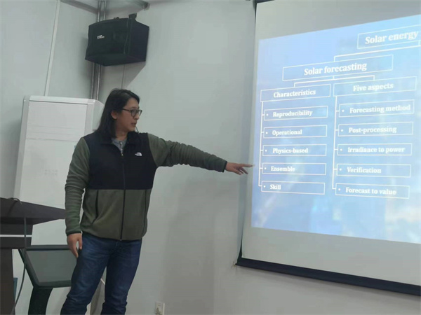 杨大智系统介绍了国内外太阳能资源评估和预报重要研究进展,分类梳理了其中关键的科学和技术问题,重点介绍了在太阳能稳固发电和预报的最新进展以及量化和优化光伏发电溢价的新方法。报告中,杨教授以开阔的国际视野,结合碳中和背景下太阳能发展的重大需求,强调了搭建太阳能工程和大气科学基础研究桥梁的必要性与迫切性。报告引起了大家浓厚的兴趣,参会人员和杨教授针对光伏扩建与储能配置、太阳能利用中的使用效率、合并电网、太阳能民用瓶颈技术及效益分析等问题进行了热烈的讨论。