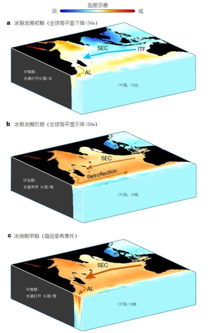 SEC: 南赤道流;AL: 阿古拉斯泄漏;ITF: 印尼贯穿流;IO:印度洋;Retroflection: 回流 a, 在冰期发展的初期(全球海平面下降不超过50米时),印度尼西亚群岛大半位于海平面之下,生成了较强的印尼贯穿流(Indonesian Through Flow,ITF),并沿着南赤道暖流(South Equator Current, SEC)将来自太平洋的淡水带入印度洋。此时非洲南部亚热带锋面(Subtropical Front,SF)位置偏南,厄加勒斯泄漏(Agulhas Leakage,AL)强度适中。b, 在冰期发展的后期(全球海平面下降超50米),印度尼西亚群岛附近海域面积大量减少,导致ITF减弱,减少进入印度洋的淡水。同时, SF向北移动导致AL减弱。c,冰消期初期,由于印度尼西亚群岛附近陆地仍然暴露在外(全球平均海平面仍比当前要低50米以上),ITF仍然较弱。然而,SF向南移动导致AL的恢复,从而将印度洋的高盐水释放到南大西洋。