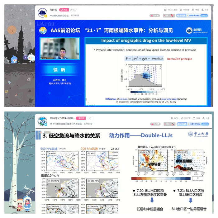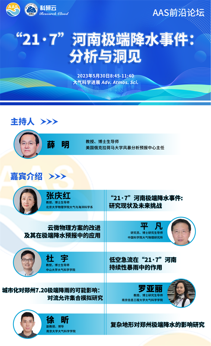 本次前沿论坛由AAS共同主编,美国俄克拉荷马大学薛明教授亲自主持。北京大学张庆红教授,中科院大气物理研究所平凡研究员,中山大学杜宇教授,南京信息工程大学罗亚丽教授,南京大学徐昕博士分别介绍了关于“21·7”河南极端降水事件的研究进展。
