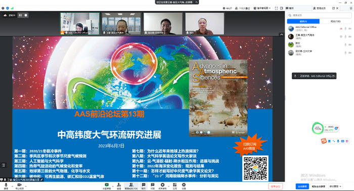 2023年6月7日,《大气科学进展》(AAS)第13期线上前沿论坛“中高纬度大气环流研究进展”顺利举办。论坛在腾讯会议和大气所B站同步直播,吸引了近7000人次观看。