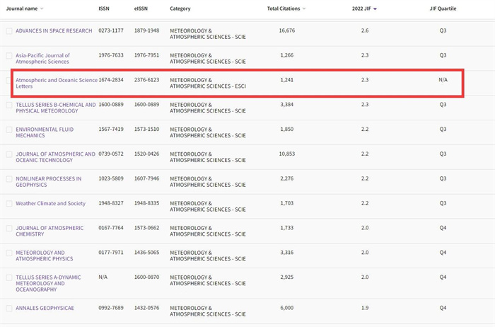 在JCR 气象和大气科学分类,SCIE(94本)期刊和ESCI(15本)期刊合并排名中,AOSL位居Q3(73/109)。