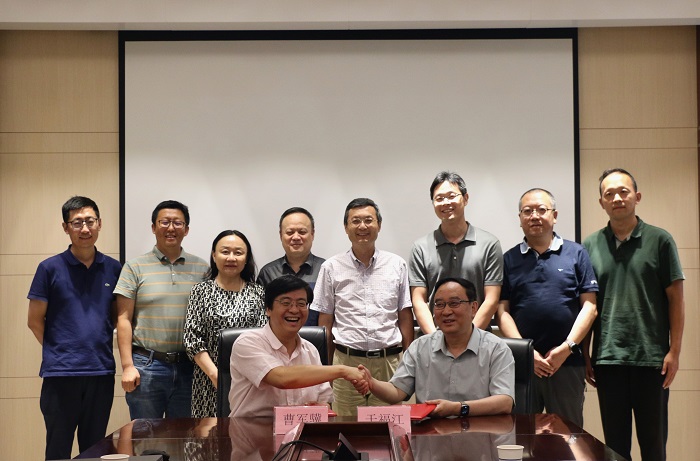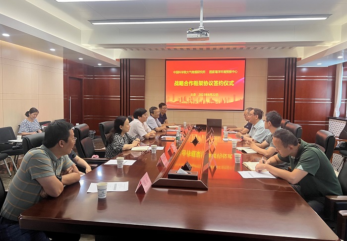 2023年8月22日下午,自然资源部国家海洋环境预报中心主任、党委书记于福江一行四人调研大气所,大气所所长曹军骥主持座谈会议并首次签署合作协议。