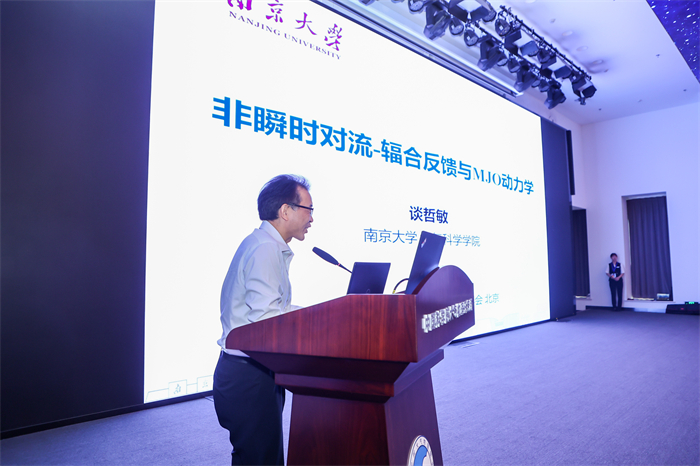 谈哲敏院士、黄建平院士、朱彤院士和蔡文炬院士以及熊绍员司长、于福江主任分别作大会特邀报告。谈哲敏院士作了题为“非瞬时对流-辐合反馈与MJO动力学”的报告,介绍了团队提出的非瞬时对流-辐合反馈(NICCF)机制,为MJO等大尺度对流系统的组织、发展、移动提供了全新的、更加合理的物理解释。黄建平院士作了“动力模式和人工智能在构建预测系统中的作用”报告,研究结论揭示数学建模是构建预测系统的基础、人工智能可以用于短期预测,但无法准确预测极端事件的发生,只有数学建模和人工智能相结合才能做出准确预测。朱彤院士在“大气复合污染新进展:理论框架的建立”报告中,从排放清单、仪器研发、大气化学过程等方面介绍了近几年中国大气复合污染的研究成果,并展望了大气化学与人体健康、气候变化、碳中和等研究前景。蔡文炬院士在“Changing ENSO and its impacts in a warming climate”报告中,讨论了ENSO变化对热带-热带外相互作用、热带北大西洋海表温度变率、极端副高事件、南大洋变暖、南极冰架和全球经济增长等方面的影响。中国气象局科技与气候变化司熊绍员司长作了题为“推进科技管理改革创新,引领支撑气象高质量发展”的报告,介绍了近年来气象局在气象科技创新顶层设计、组织关键核心技术攻关、科技成果管理等方面的诸多改革举措。国家海洋环境预报中心于福江主任的“构建全谱系自主海洋模式技术体系”报告,围绕形势与背景、构建全谱系自主海洋模式技术体系、人工智能预报技术进展等方面进行交流,重点介绍了该中心自主开发的各类“妈祖”系列海洋模式主要技术特点及未来发展方向。