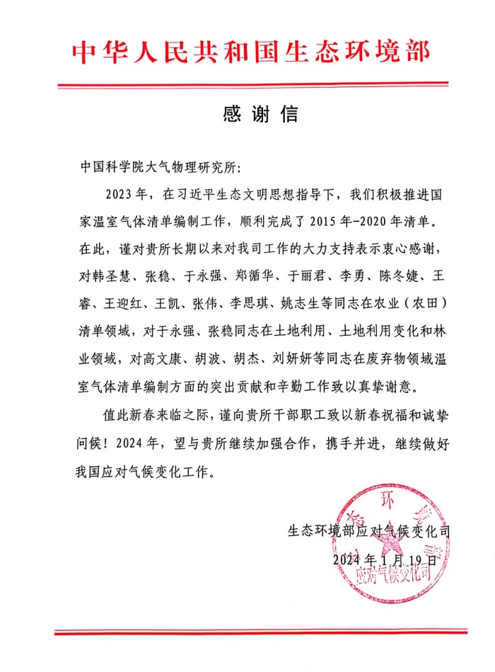 近日,生态环境部应对气候变化司给大气物理研究所发来感谢信,感谢大气物理研究所相关科研团队在农业(农田)、土地利用变化和林业、废弃物等领域的温室气体清单编制工作中所作出的辛勤工作和突出贡献,并希望与大气物理研究所加强合作,携手并进,继续做好我国应对气候变化工作。
