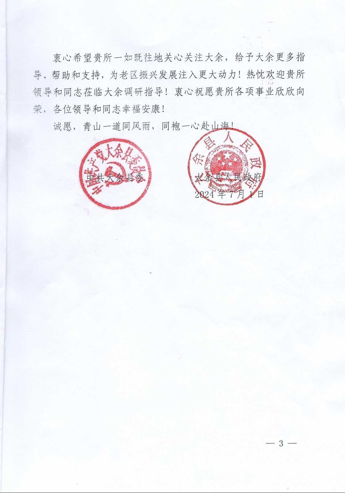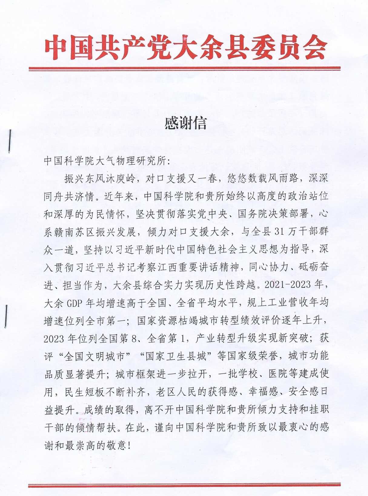 韩相云代表大余县委、县政府给大气所送来感谢信和嘉奖证书,对大气所两年来给予大余县建设的支持表示感谢,并邀请曹军骥带队再次实地考察调研大余县。(科技处、人事处联合供稿)